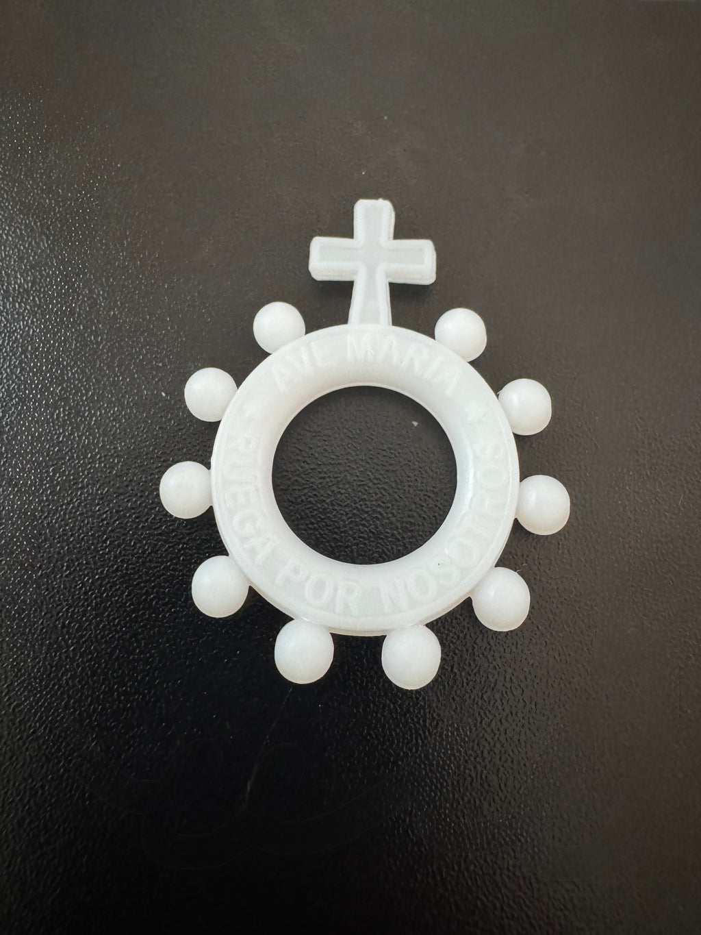 Incluye un decenario en plástico integrado, ideal para quienes desean rezar el Santo Rosario en cualquier lugar, facilitando la devoción y la meditación de los misterios de la vida de Jesús y de la Virgen María.