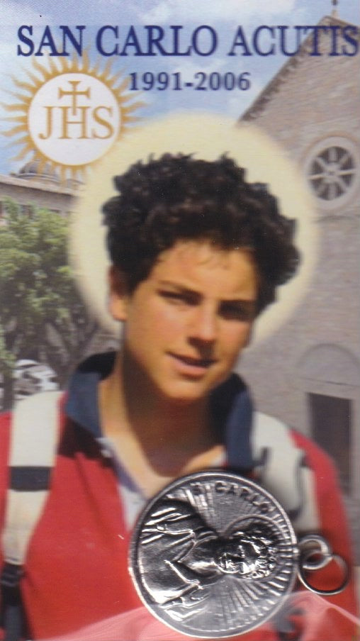 Hermoso set devocional de San Carlo Acutis que incluye una estampita a color con oración al reverso y una medalla con su imagen. Ideal para jóvenes, estudiantes y devotos de la Eucaristía. Perfecto para llevar en la cartera, en el rosario o como regalo espiritual. Inspirado en el testimonio del “ciberapóstol de la Eucaristía”.